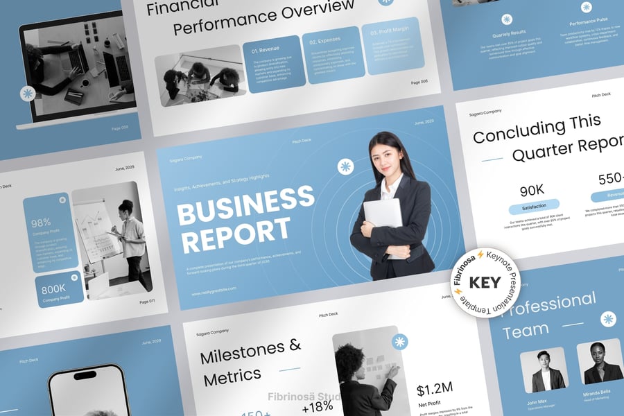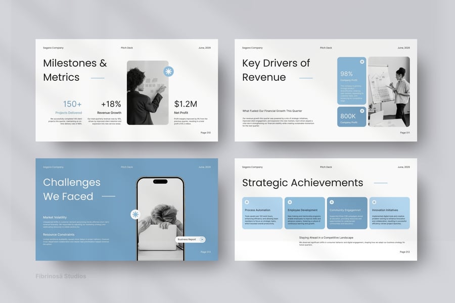 * **财务报告:**通过清晰的信息图表和结构化的数据幻灯片,清晰地呈现**里程碑**、**指标**和**收入驱动因素**。