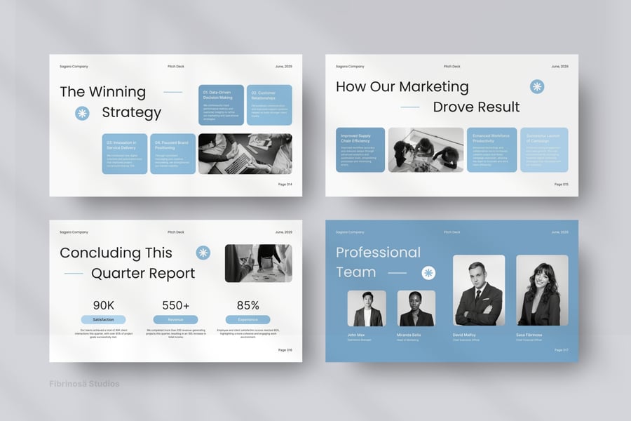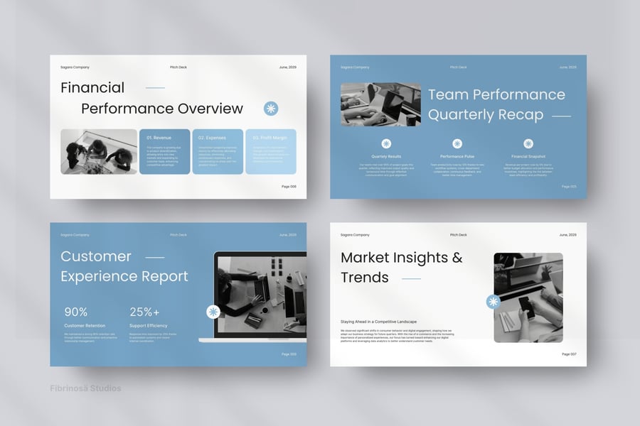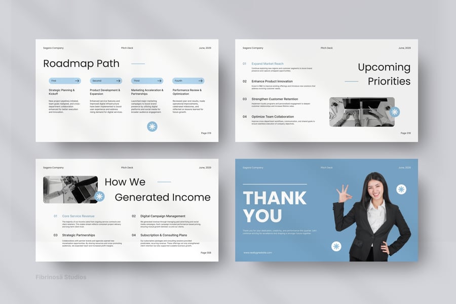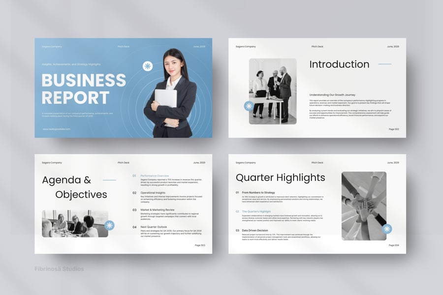使用这款简洁专业的演示模板,全面展现贵公司的发展概况。**Sagara** 专为企业领导者和分析师设计,采用清晰可靠的美学风格,以明亮的白色布局搭配柔和的蓝色调,确保高度的易读性和重点突出。
