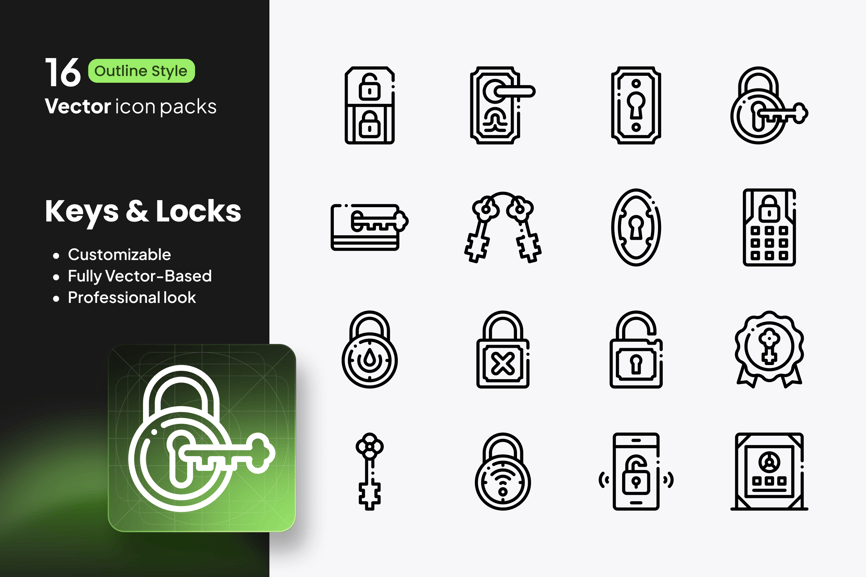 – 16 个钥匙和锁图标(挂锁、钥匙孔、保险箱、智能锁、传统钥匙)