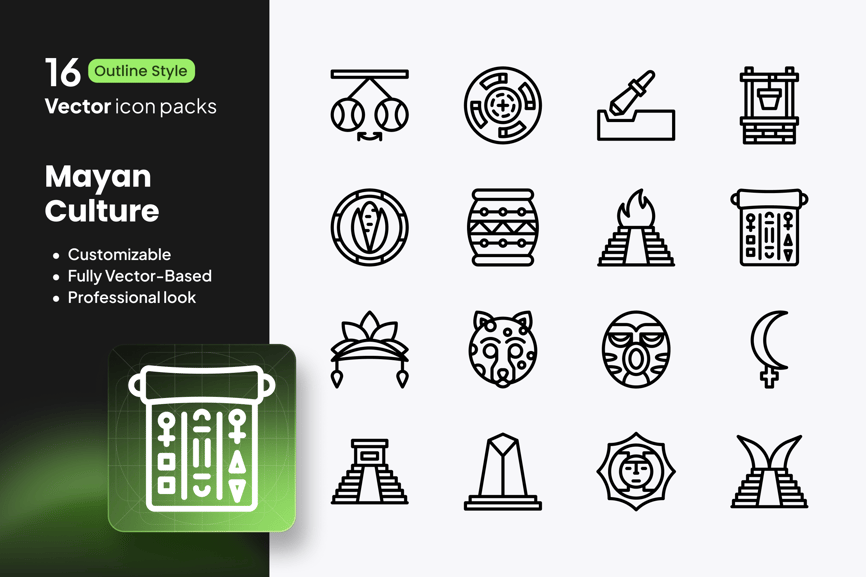 开启一段沉浸式的玛雅文化之旅,这套精心设计的16个简洁轮廓风格矢量图标将带您领略玛雅风情。该系列图标细致入微地捕捉了金字塔、历法、面具、神庙、象形文字、神祇和仪式符号的精髓,是教育材料、文化活动、旅游宣传、历史文献和创意品牌推广的理想资源。