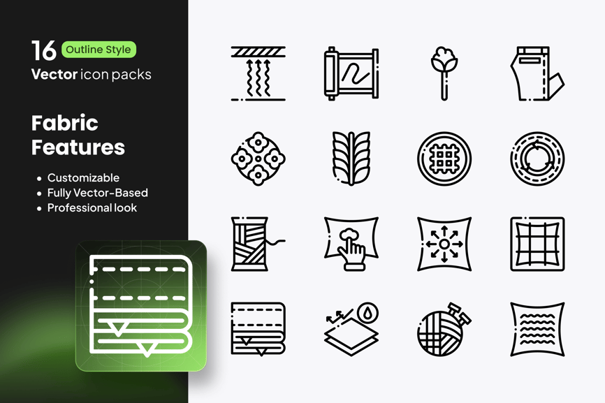 使用这套包含 16 个精心设计的轮廓风格矢量图标的“面料特性图标集”,提升您的纺织品品质沟通效果。该图标集细致地描绘了面料卷曲、纹理、针脚、柔软触感、防水、透气、弹力以及耐用性等材料特性,是时尚品牌推广、纺织品展示、服装标签、电子商务和产品包装的理想之选。