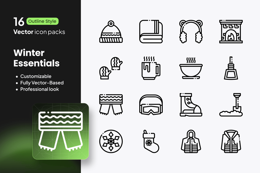 这款冬季必备图标套装包含 16 个简洁的轮廓风格矢量图,让您在寒冷季节也能保持温暖时尚。从外套、围巾、手套、帽子、靴子到盛满热饮的马克杯,该系列囊括了寒冷季节的舒适必备单品。
