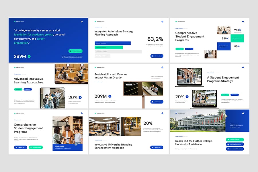 非常适合大学、学院、学校、在线学习平台和学术顾问使用,每张幻灯片都经过精心设计,以引人入胜的方式展示机构成就、学术课程、教师亮点、招生流程和学生成功案例。