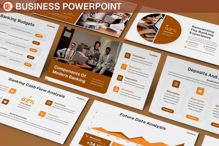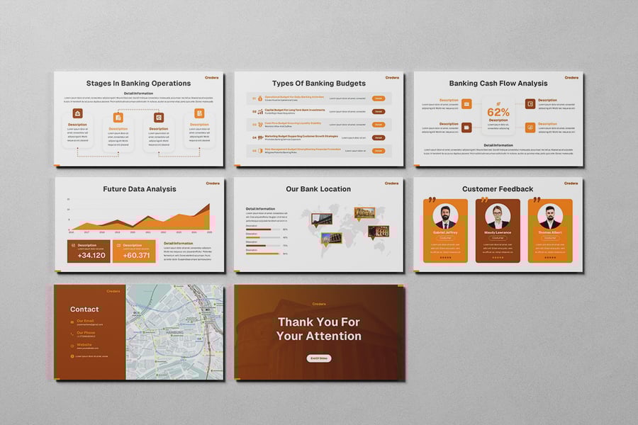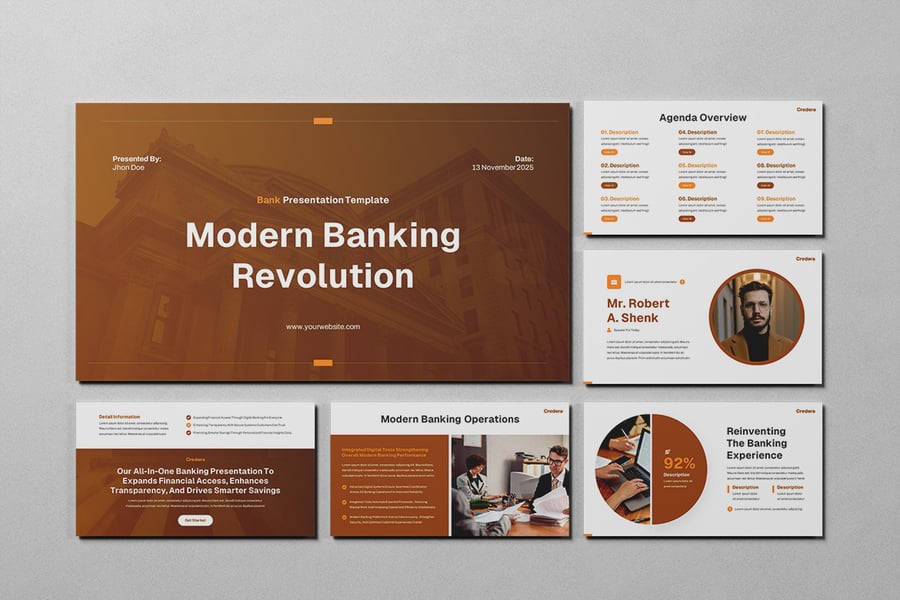 这款模板采用简洁专业的视觉设计,能够将复杂的银行数据、绩效指标和财务策略转化为清晰、结构严谨的叙述。无论您是展示季度业绩、阐述贷款组合,还是概述数字化银行举措,它都能确保您的信息传递自信、准确且令人信服。