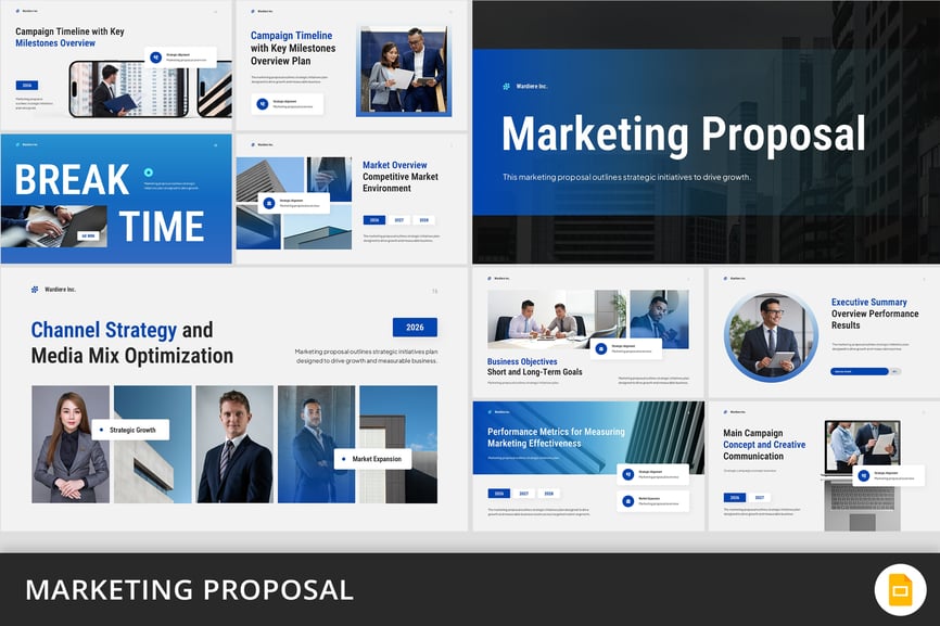 它采用现代简约设计,注重视觉层次感和数据驱动的布局,将美学上的卓越与实用功能相结合,使其成为展示营销计划、活动策略、业务增长计划和品牌传播路线图的理想选择。