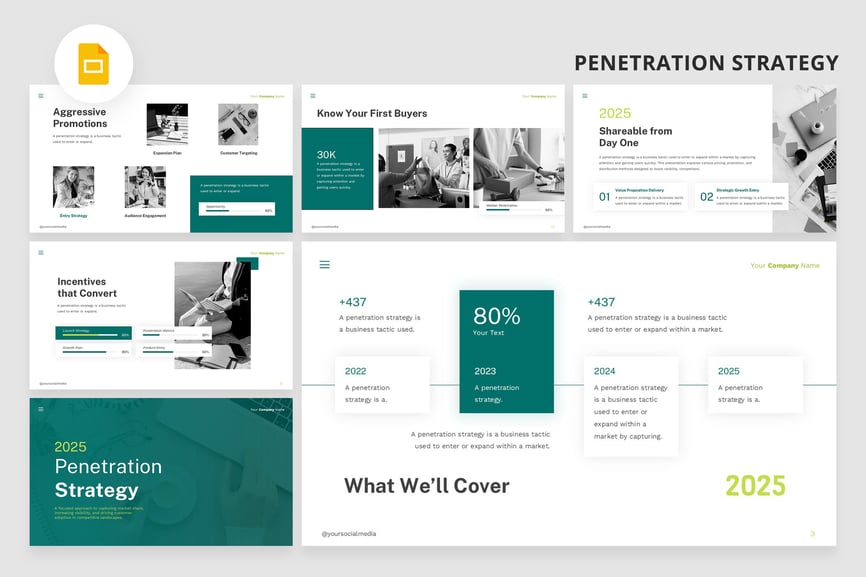 **市场营销策略 – 渗透策略 Google 幻灯片演示文稿** 使用“市场营销策略”模板,提升您的演示文稿效果。这款多功能、创意十足且设计简洁的 Google 幻灯片模板,专为企业和个人用途而设计。该模板融合了现代美学和专业气质,是任何希望给客户或利益相关者留下深刻印象的人士的理想之选。凭借其灵活的风格和简洁的设计,“市场营销策略”模板可提升您的演示文稿质量,使其成为有效传达理念和提升客户参与度的必备工具。