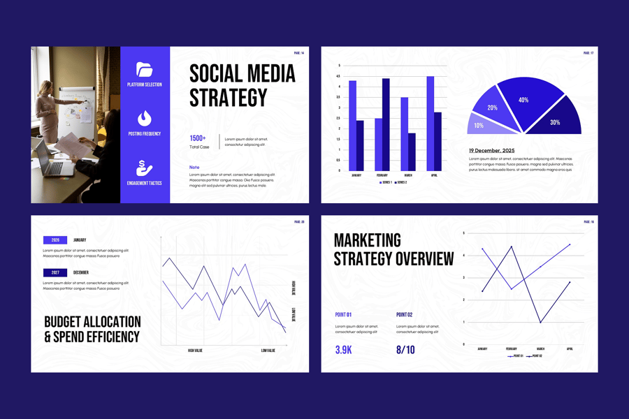 使用这款简洁现代的营销计划演示模板,自信地展示您的下一个营销策略。该模板设计精美,令人印象深刻。它非常适合数字代理机构、企业团队、产品经理和营销顾问使用。模板结构专业,可完全自定义,助您清晰呈现品牌愿景、受众洞察、营销目标、渠道策略、预算明细和绩效指标。