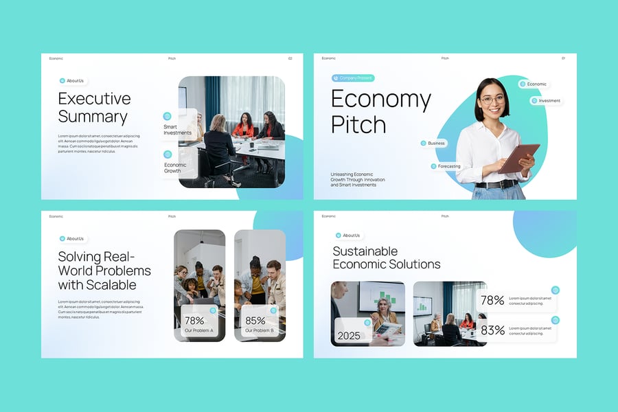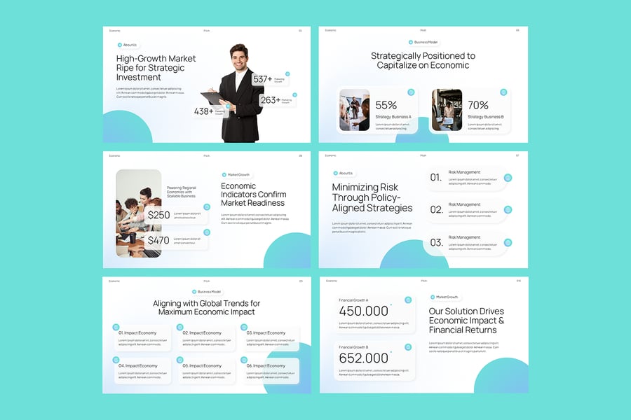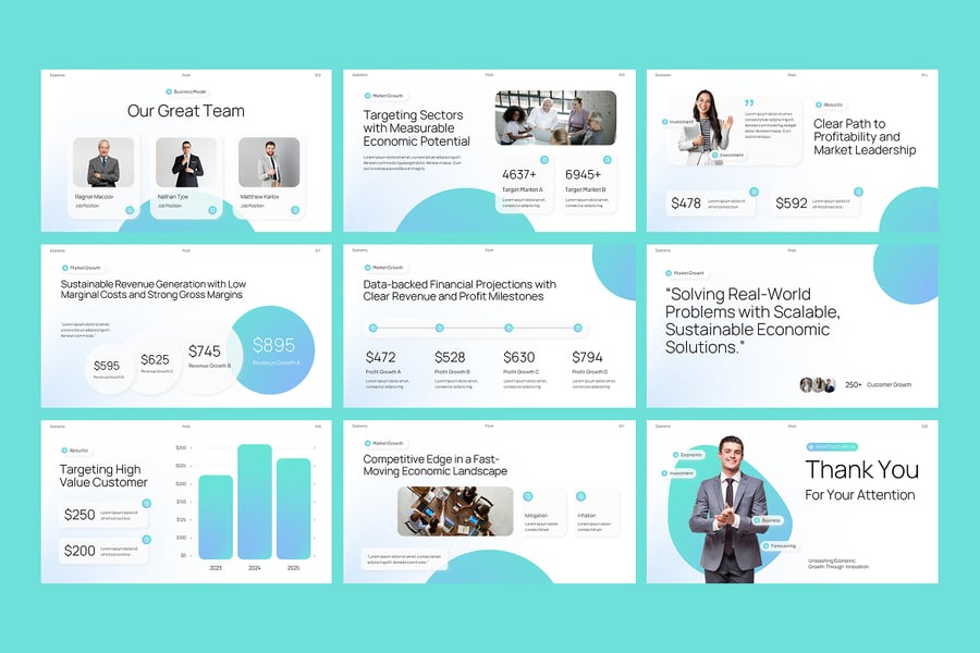 经济主题演讲模板是一款专业且现代的 PowerPoint/Keynote/Google Slides 模板,旨在帮助您清晰有力地展示商业策略、财务报告、经济预测、投资机会和市场分析。该模板采用简洁的布局、极简的图表、数据驱动的信息图和条理清晰的幻灯片,是初创公司、企业、金融分析师和经济顾问的理想之选。