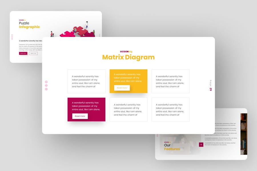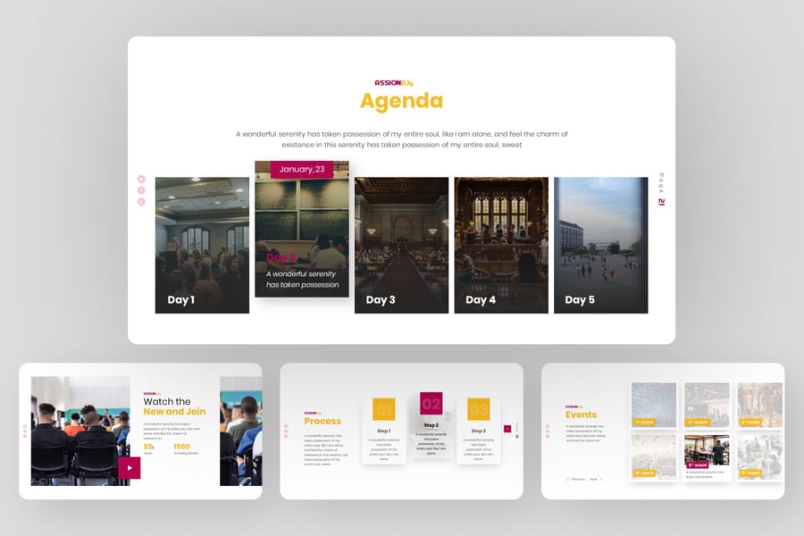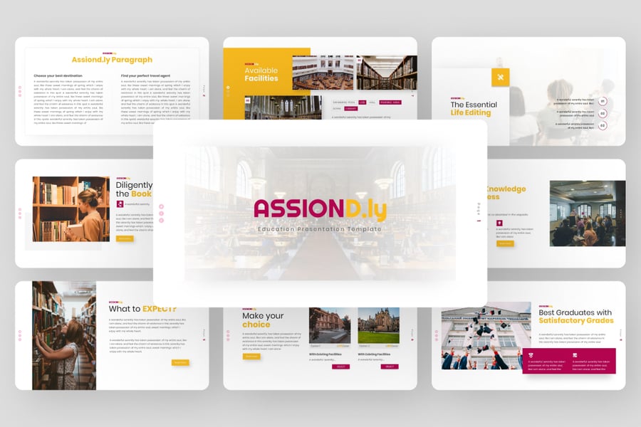 Assiond.ly 教育 PowerPoint 模板融合了多种设计元素和实用功能,使公司简介模板更具吸引力。每张幻灯片都实用且功能强大,摒弃了无用的形状和信息图表。想象一下,一个包含数百张实用幻灯片的完整演示模板。非常适合用于公司简介、企业介绍和相关主题。