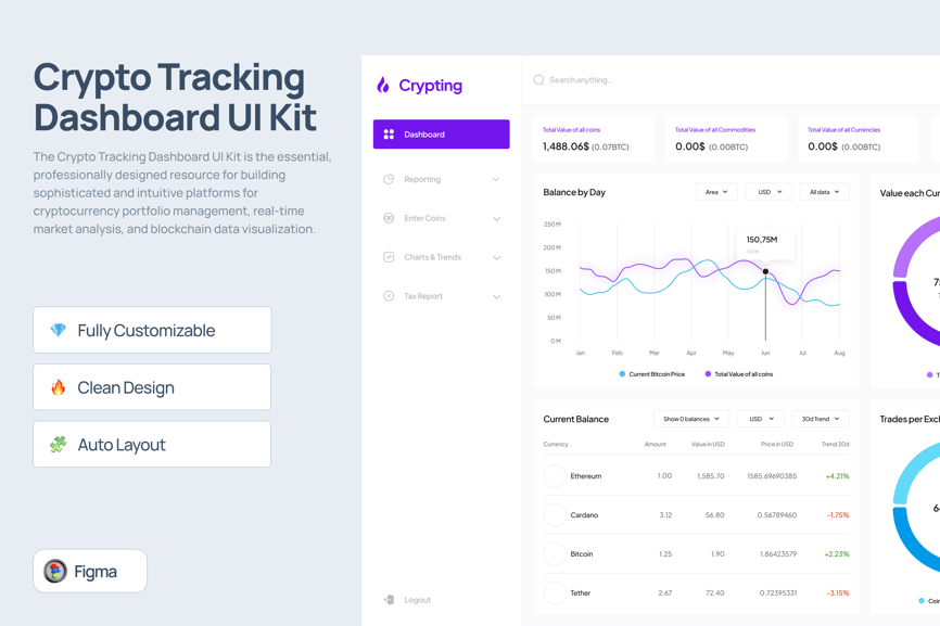 使用加密货币追踪仪表盘 UI 套件,打造功能强大、分析精准且视觉效果出色的平台,用于监控加密货币市场和追踪个人投资组合。这款必备资源专为构建全面的仪表盘而设计,适用于加密货币交易所、市场分析工具、投资组合管理服务以及专注于数字资产的金融科技平台。