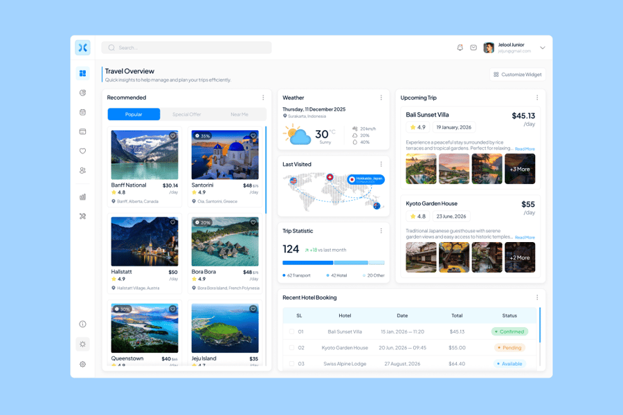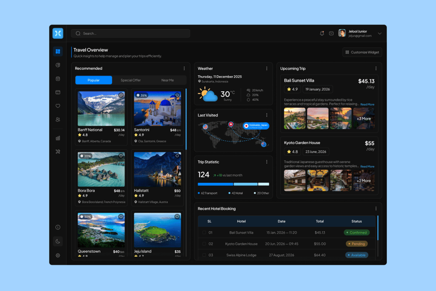 非常适合旅行仪表盘、预订管理系统、旅游平台、酒店服务、行程规划器和基于位置的管理面板。