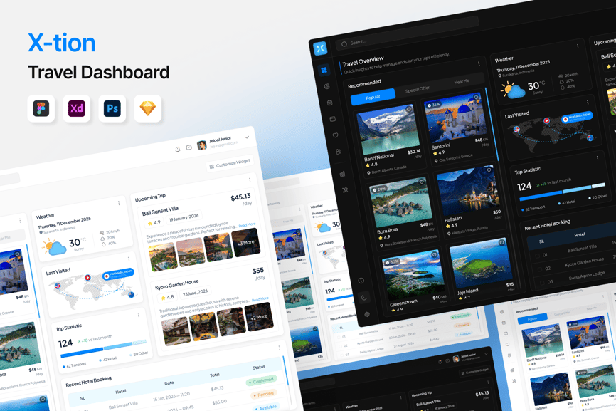 X-tion 是一款现代化且功能全面的仪表盘 UI 套件,专为旅行平台和数据驱动型应用而设计。X-tion 采用简洁的布局和用户友好的结构,能够清晰高效地管理行程数据、预订信息、行程安排和运营数据。