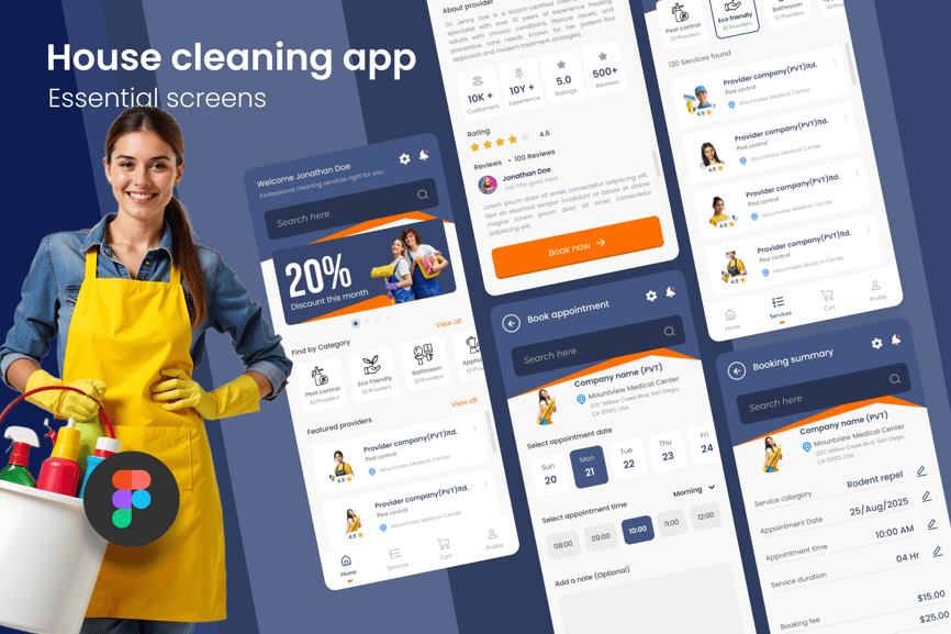 这款身份验证屏幕 UI 套件为您的移动应用的核心屏幕(包括清洁人员列表、预订、预订详情等)提供简洁易用的用户界面设计。它采用流畅的交互和清晰的行动号召,布局简洁,组件可编辑,色彩风格统一,可加快您的应用开发流程。
