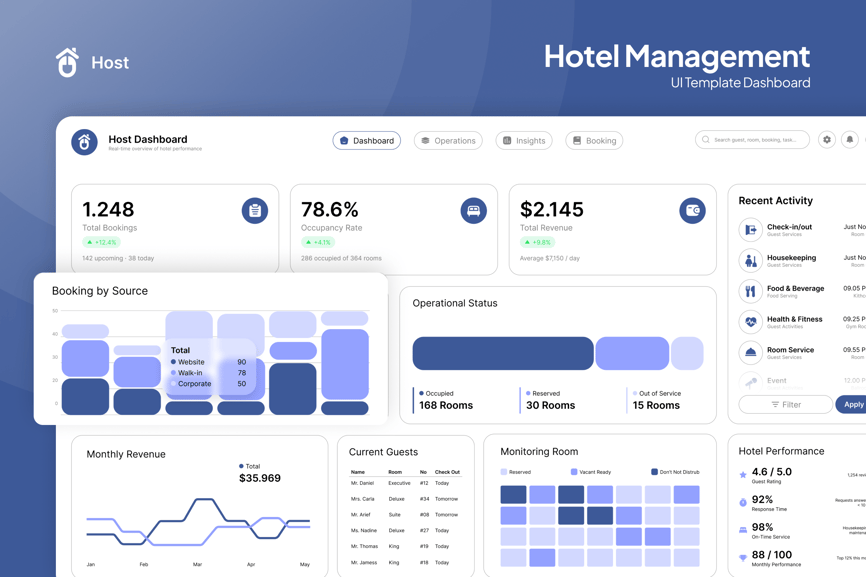 这款酒店管理仪表盘 UI 模板采用简洁现代的界面设计,专为酒店管理软件和管理型 Web 应用程序而打造。