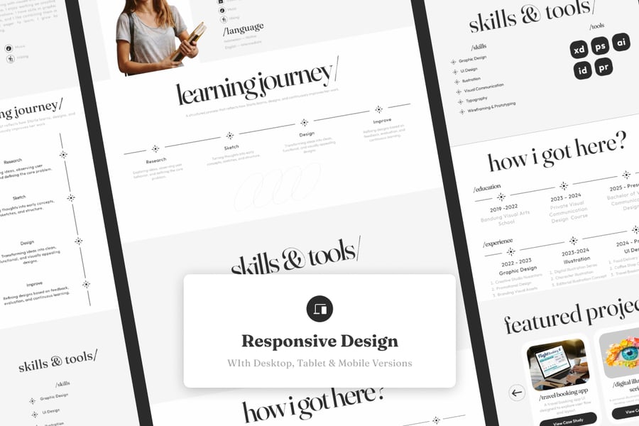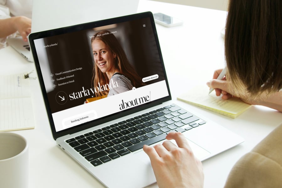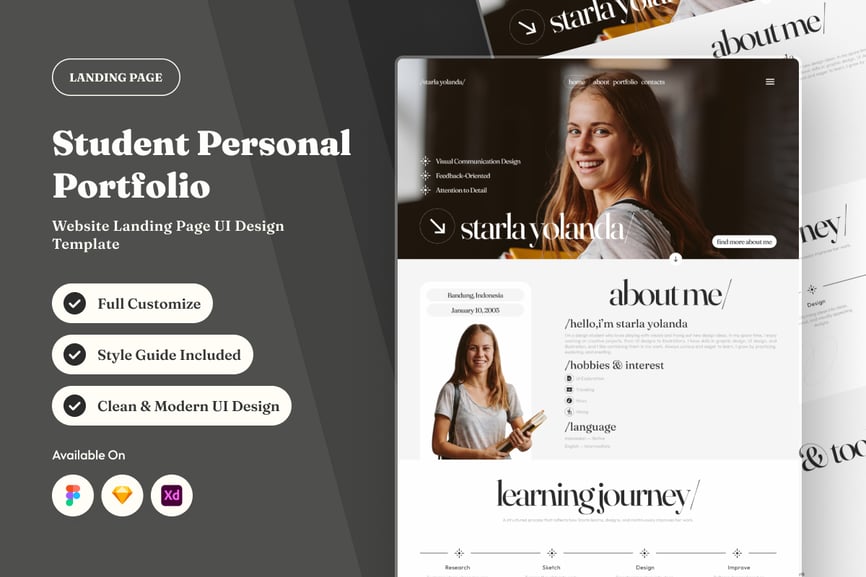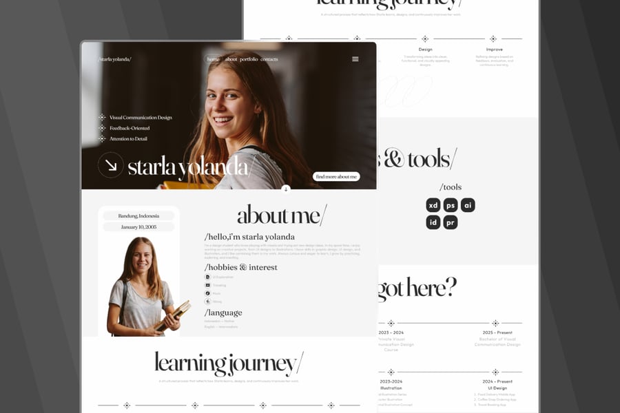 Starla 是一个学生个人作品集展示页面,设计风格柔和现代,给人以平静亲切的感觉。简洁的布局、柔和的粉彩色调和圆润的元素,帮助学生以专业且不失个性的方式展示作品。
