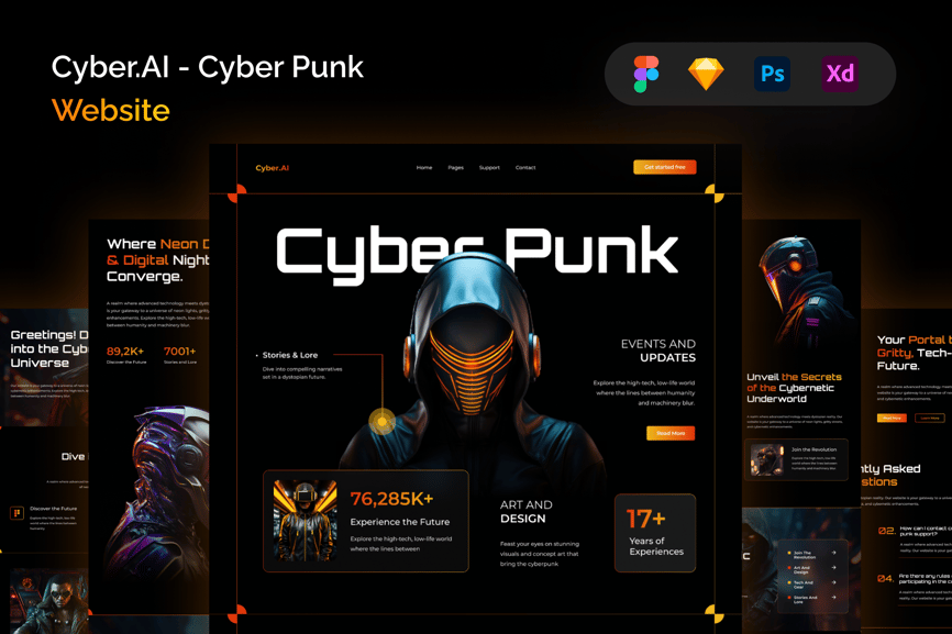 *Cyber.AI – 赛博朋克网站* 此模板简洁却不失专业现代感。您可以使用 Figma、Adobe XD、Sketch 和 Adobe Photoshop 进行编辑。轻松插入内容、更改颜色,所有模板均已包含在内,可直接与您的受众分享。所有组件均基于矢量图,完全兼容、可编辑且像素级精准。此外,它们组织有序、命名清晰、分组合理。