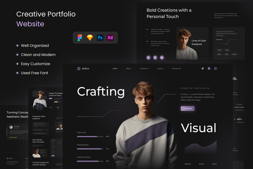 *Arthur – 创意作品集网站* 这款模板简洁却不失专业与现代感。您可以使用 Figma、Adobe XD、Sketch 和 Adobe Photoshop 进行编辑。轻松插入内容、更改颜色,所有模板均已包含在内,可直接与您的受众分享。所有组件均基于矢量图,完全兼容,可编辑且像素级精准。此外,它们组织有序,命名清晰,分组合理。