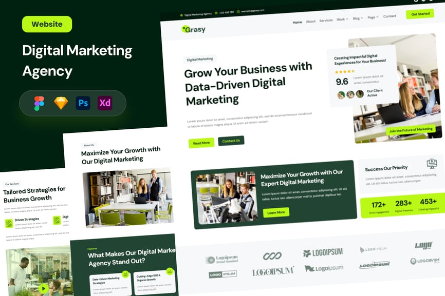 *Grasy – 数字营销机构网站* 此模板简洁却不失专业与现代感。您可以使用 Figma、Adobe XD、Sketch 和 Adobe Photoshop 进行编辑。轻松插入内容、更改颜色,所有模板均已包含在内,可直接与您的受众分享。所有组件均基于矢量图形,完全兼容、可编辑且像素级精准。此外,它们组织有序、命名清晰、分组合理。