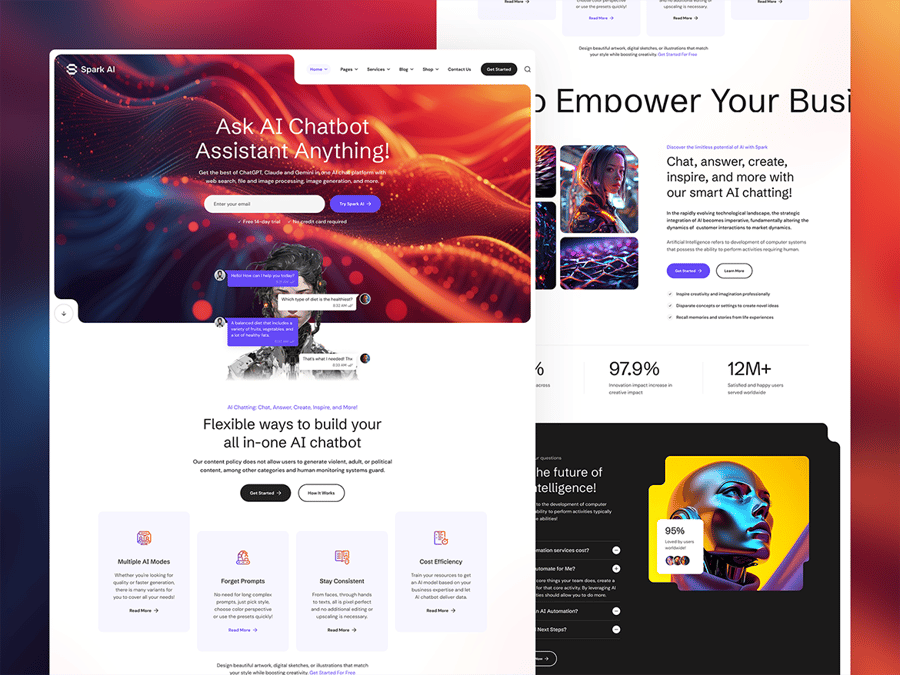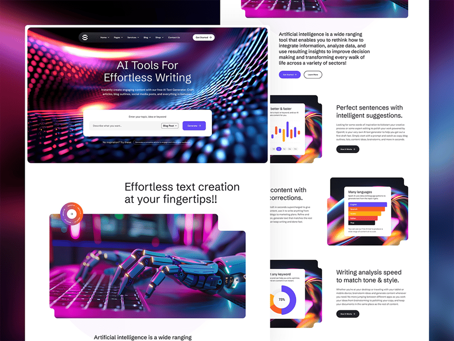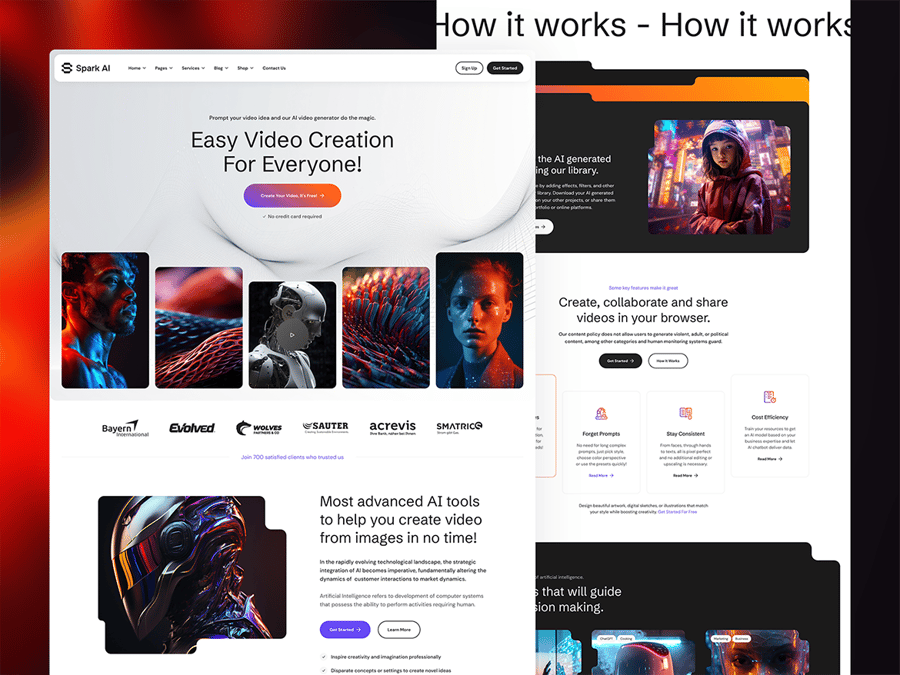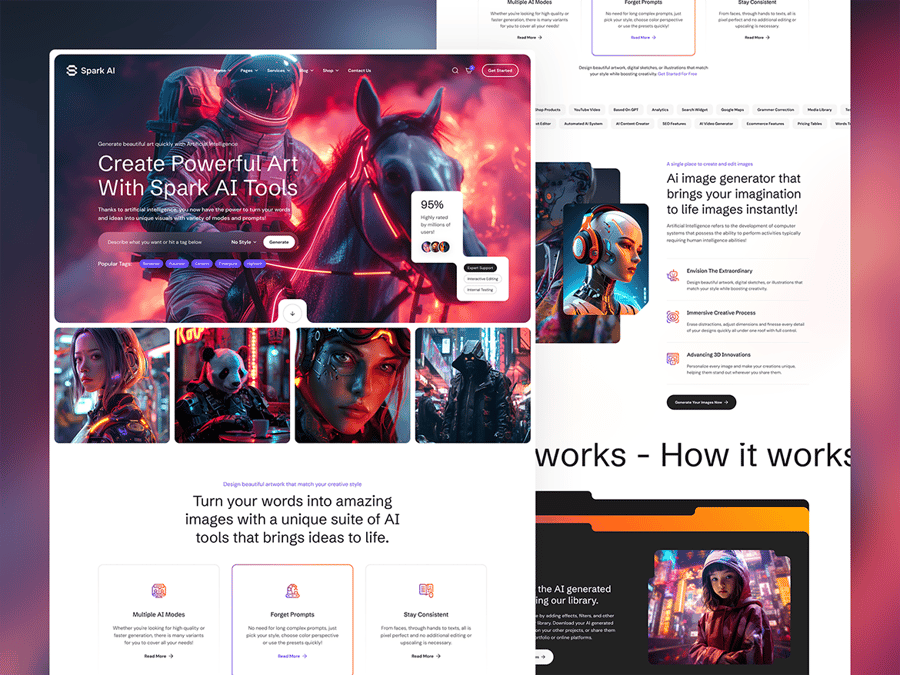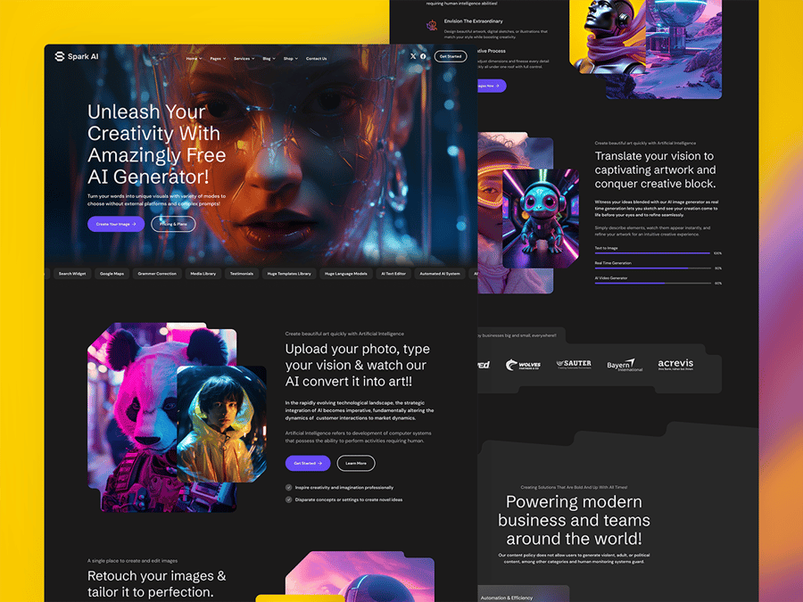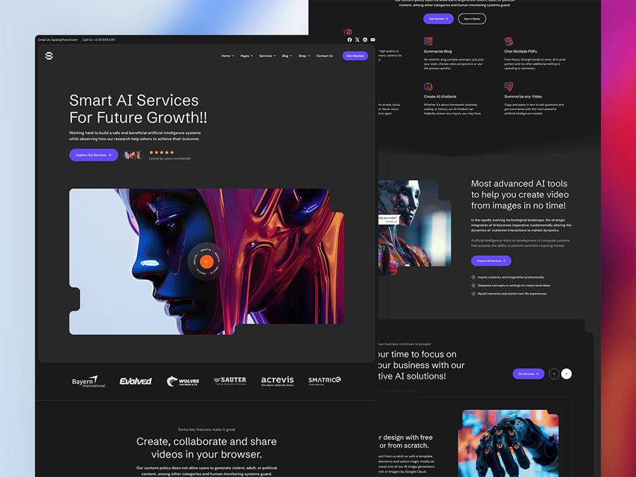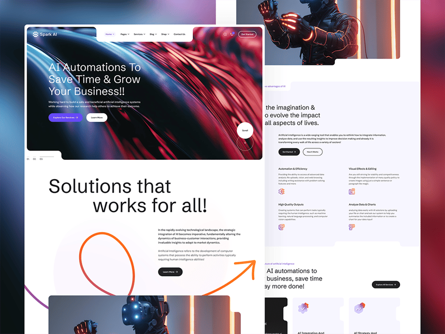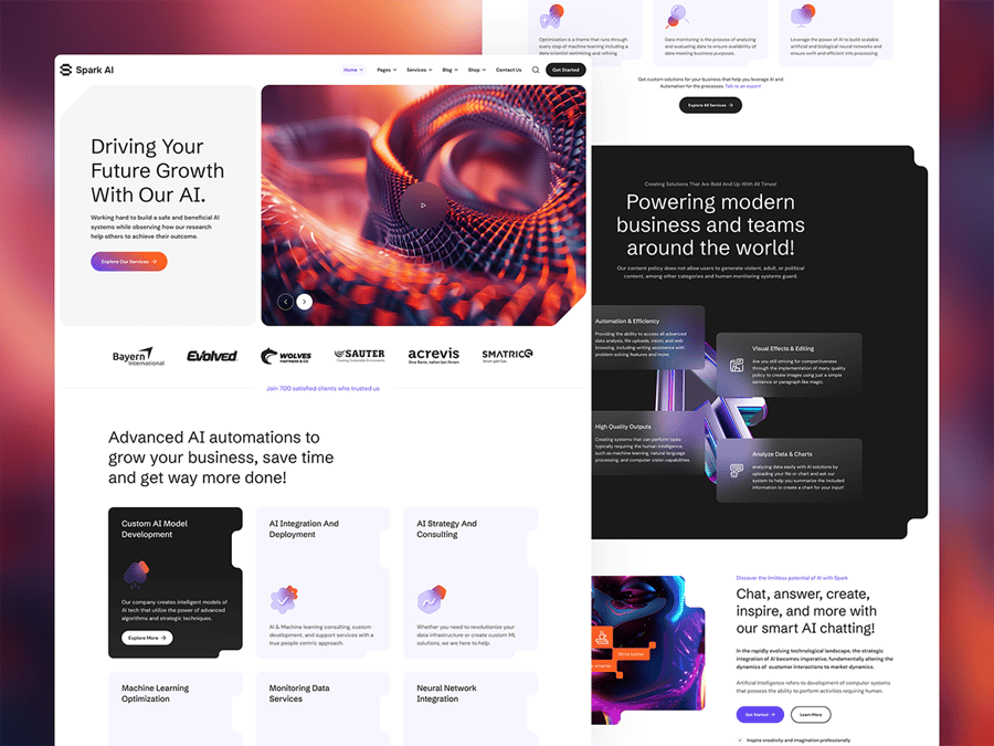 Spark 非常适合人工智能机构、人工智能初创公司、人工智能聊天机器人、人工智能助手、SaaS、数字机构、人工智能咨询、IT 解决方案、人工智能文本生成器、人工智能图像生成器、人工智能视频生成器、人工智能语音生成器、数据科学、营销、人工智能聊天工具、OpenAI、人工智能生成器、深度学习、机器学习、神经网络、人工智能或其他现代技术企业,可提供所有必要的布局和模块。我们已设计了专门的企业演示和页面,方便您轻松使用并启动您的新网站。