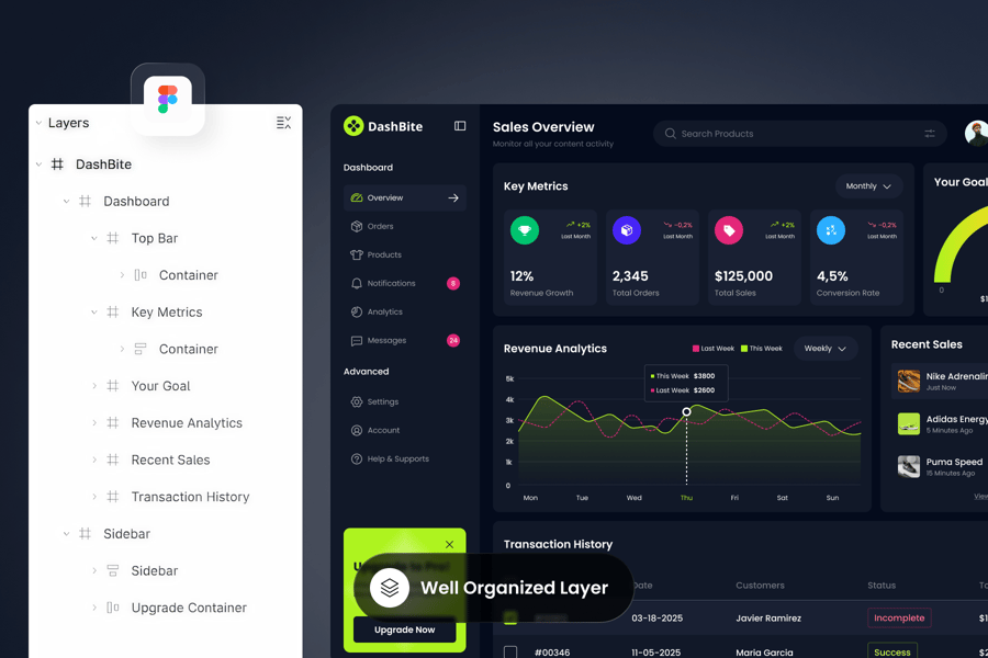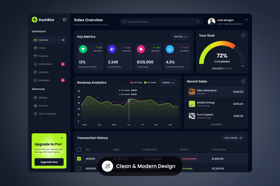 DashBite 是一款现代化的数据驱动型仪表盘模板,专为企业打造,旨在帮助他们追踪和优化销售业绩。它提供关键指标,例如收入增长、订单总数、销售额和转化率,方便团队轻松监控进度。凭借实时分析、目标追踪和详细的交易历史记录,DashBite 可帮助企业更快地做出明智的决策。