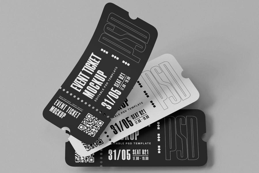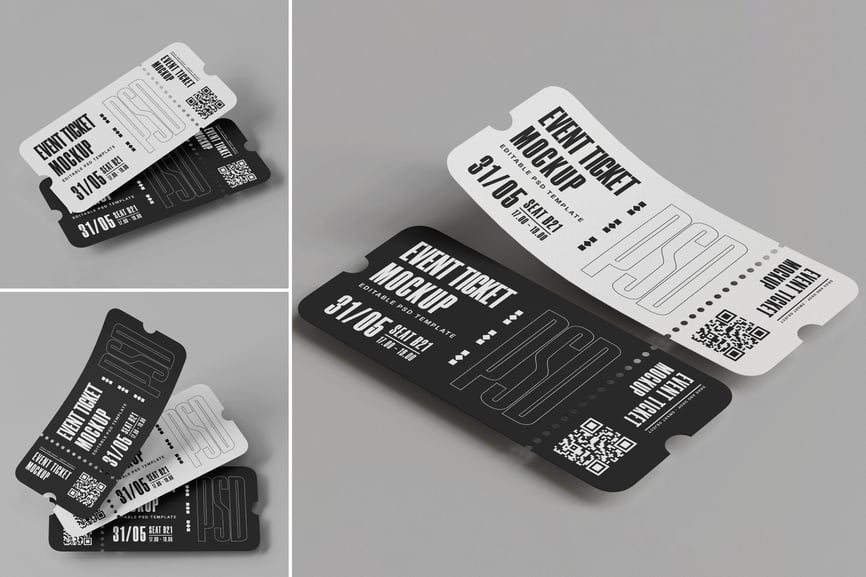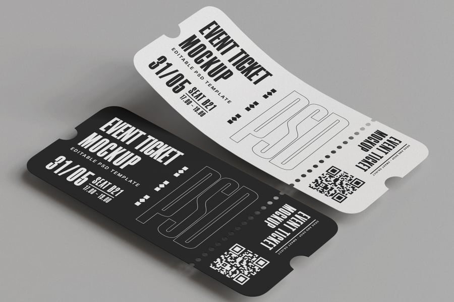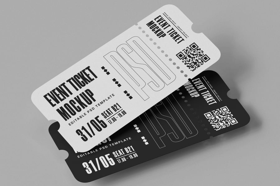 使用这款活动门票样机,以简洁专业的布局展示您的活动门票。这款高分辨率 PSD 样机(4000×3000 像素,300 DPI)包含黑白两款门票样式,搭配简约背景,适用于各种主题。它可通过智能对象进行完全自定义——轻松更改文本、颜色、二维码和背景。非常适合用于音乐会、节日、会议、剧院或体育赛事。该样机包含分层 PSD 文件和逼真的阴影效果,为您的设计演示增添深度和真实感。