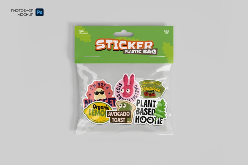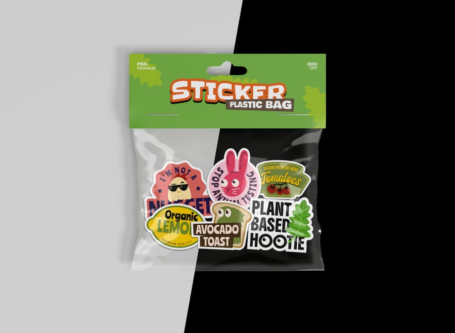 使用这款**塑料袋贴纸样机**展示您的设计产品。文件包含颜色对象和背景的独立图层。标签的智能图层方便您轻松应用设计,使用简单。