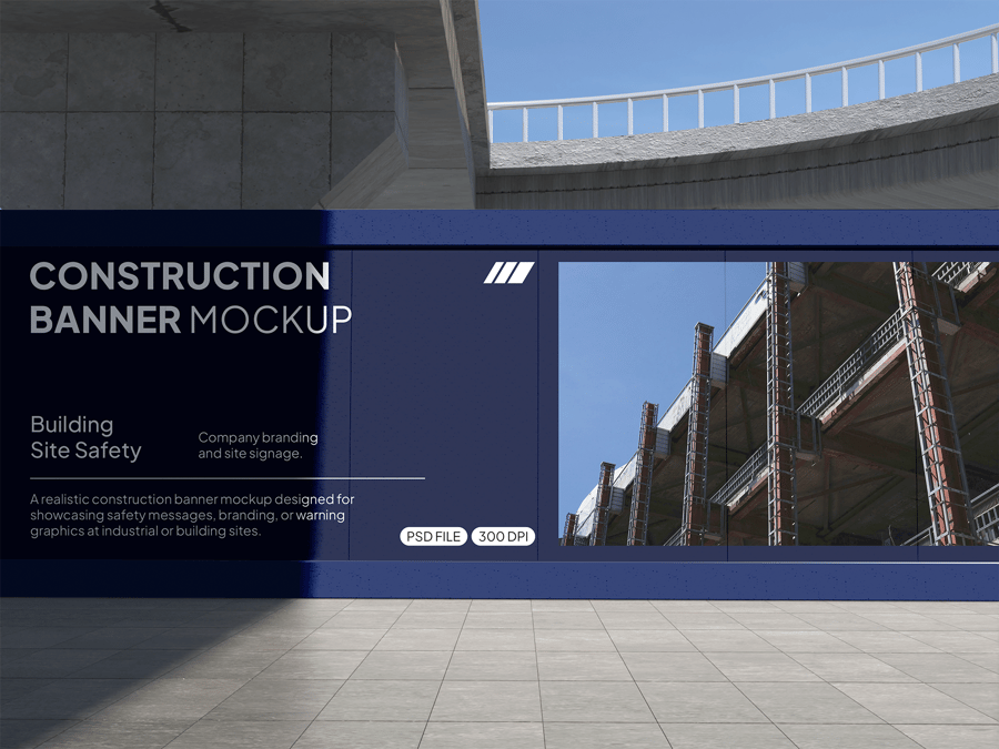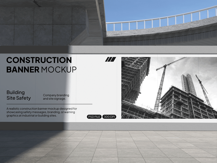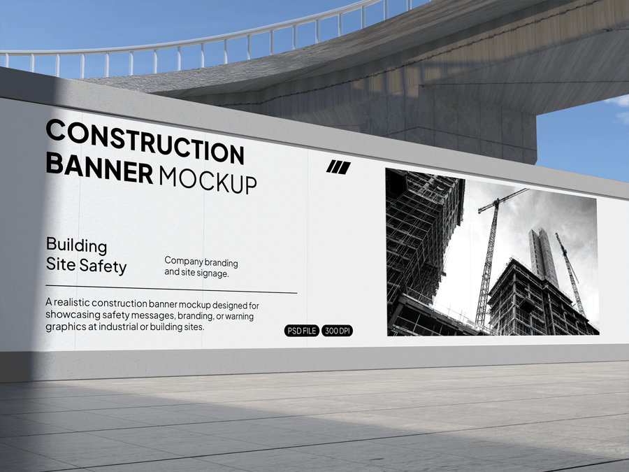 使用这款**施工横幅样机**展示您的大幅广告或工地标牌,非常适合建筑工地、基础设施项目和安全宣传。**完美适用于承包商品牌推广、项目公告和户外宣传。**