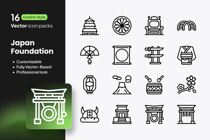 这套由日本国立基金会精心设计的16款图标,旨在纪念日本丰富的文化遗产。每款图标都体现了一种独特的文化元素,包括国旗、寺庙、武士头盔、地图、文化图案、庆典活动和历史符号。这些图标非常适合用于各种文化项目、旅游指南、活动海报、教育材料和节庆宣传。