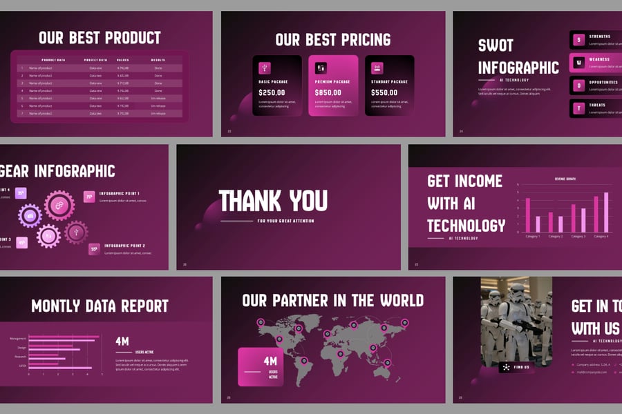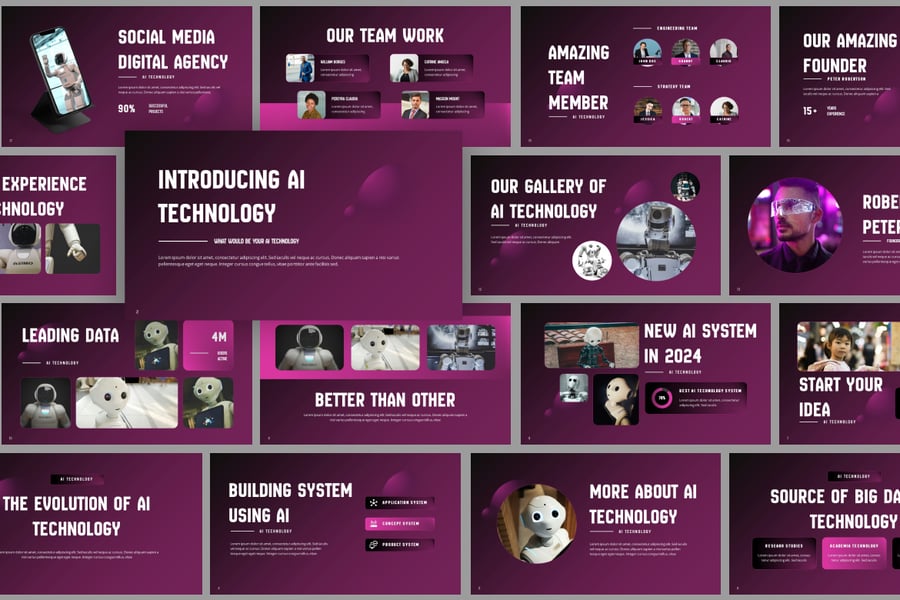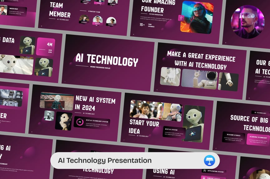 “人工智能技术主题演讲”是一个动态且引人入胜的模板,专为希望展示人工智能在各行各业变革性影响的专业人士、教育工作者和创新者而设计。该演讲有助于以清晰且令人信服的方式传达复杂的人工智能概念和应用。