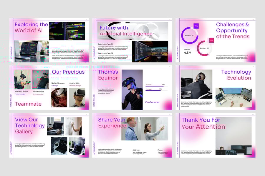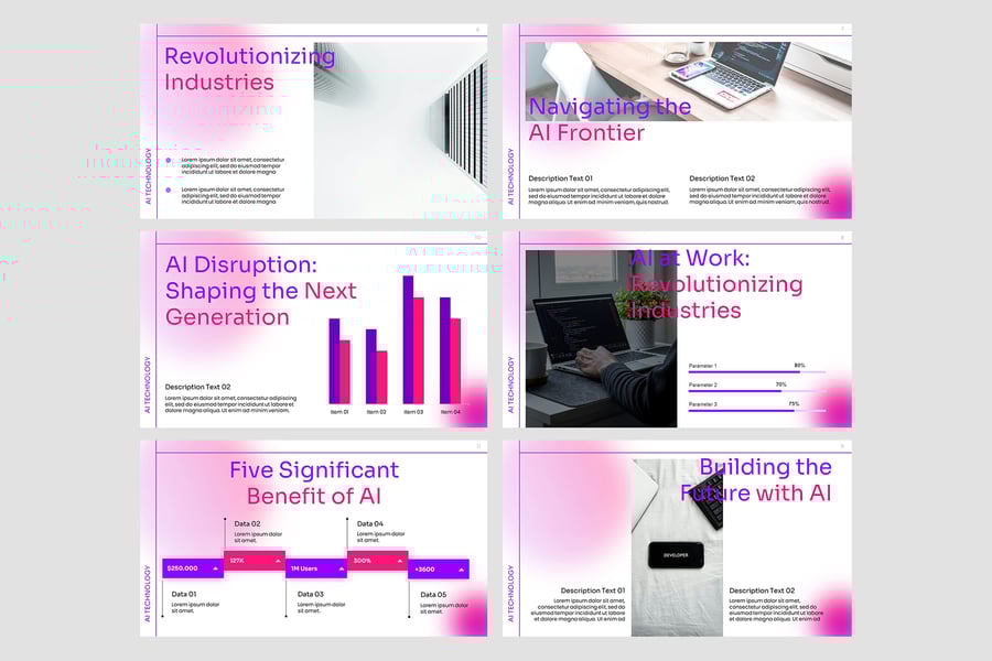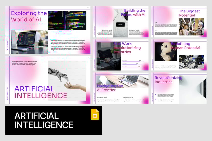 这款专为 Google Slides 设计的**人工智能技术**模板,旨在帮助您清晰详尽地进行演示。该人工智能技术演示模板采用简洁时尚的前沿设计,专为展示人工智能、机器学习、数据科学和自动化领域的最新进展而打造。此模板可帮助科技公司、初创企业、研究人员和创新者以直观易懂且专业的方式呈现复杂的人工智能概念。