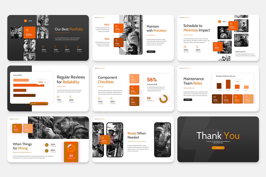 **使用“电气维护计划演示文稿”模板,让您的演示焕然一新——这款简洁、现代且功能全面的模板专为专业人士和创意人士量身打造。** 该设计完美融合了时尚与实用性,助您给客户和利益相关者留下深刻印象。借助这款打造高效演示的必备工具,提升您的创意,吸引观众,并留下持久的印象。