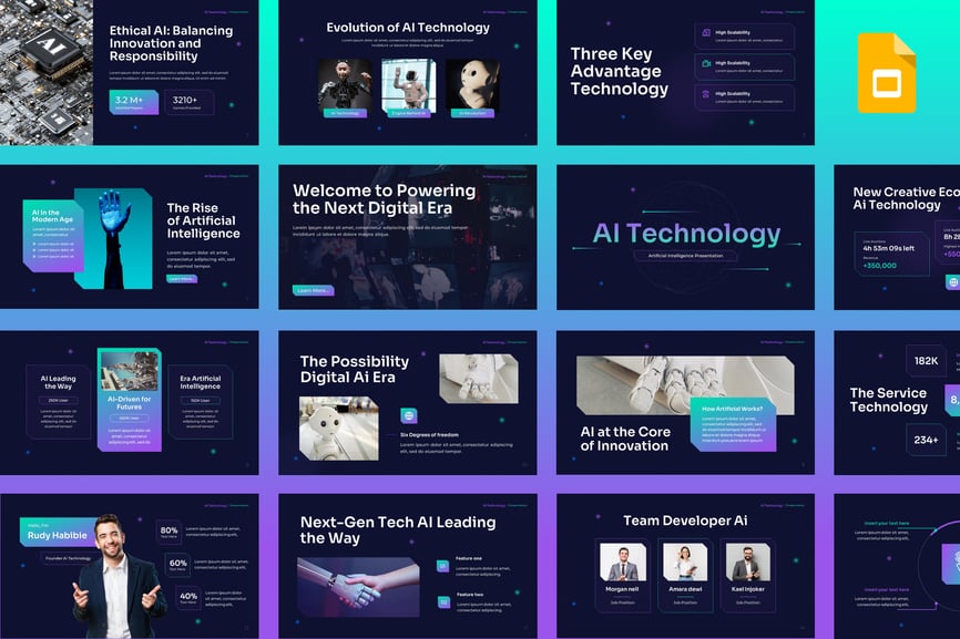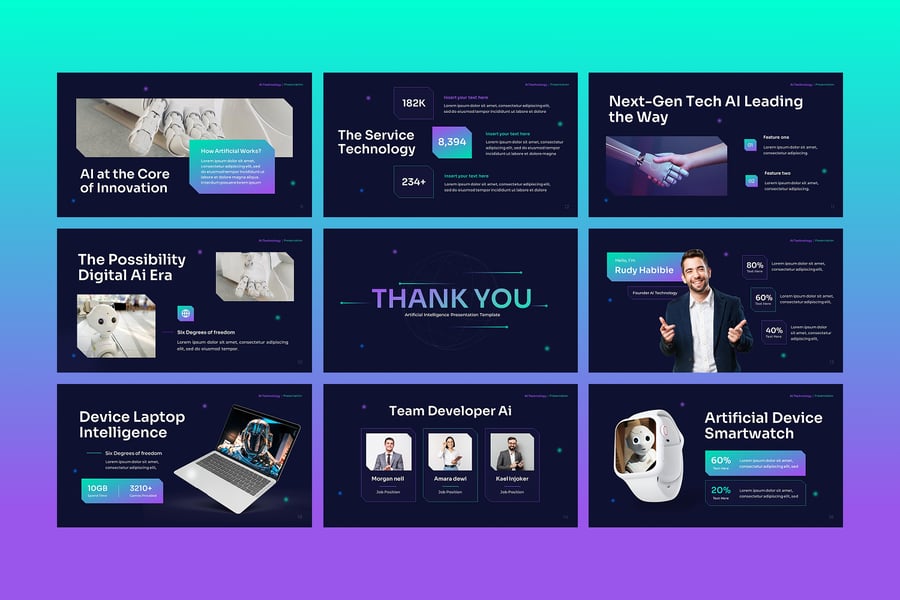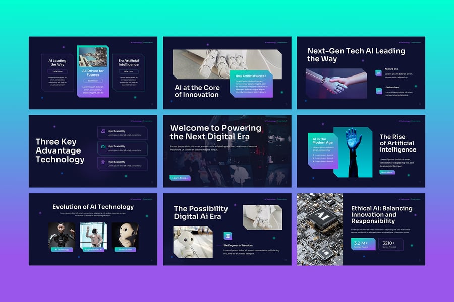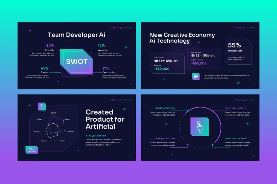 其他设计用途:人工智能路演PPT、科技创业公司演示文稿、数据科学幻灯片、人工智能仪表盘模板、技术网络研讨会幻灯片、神经网络演示文稿、专业技术模板、可编辑人工智能幻灯片、创新与技术。