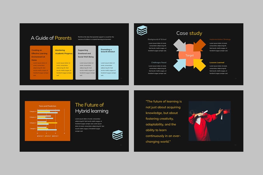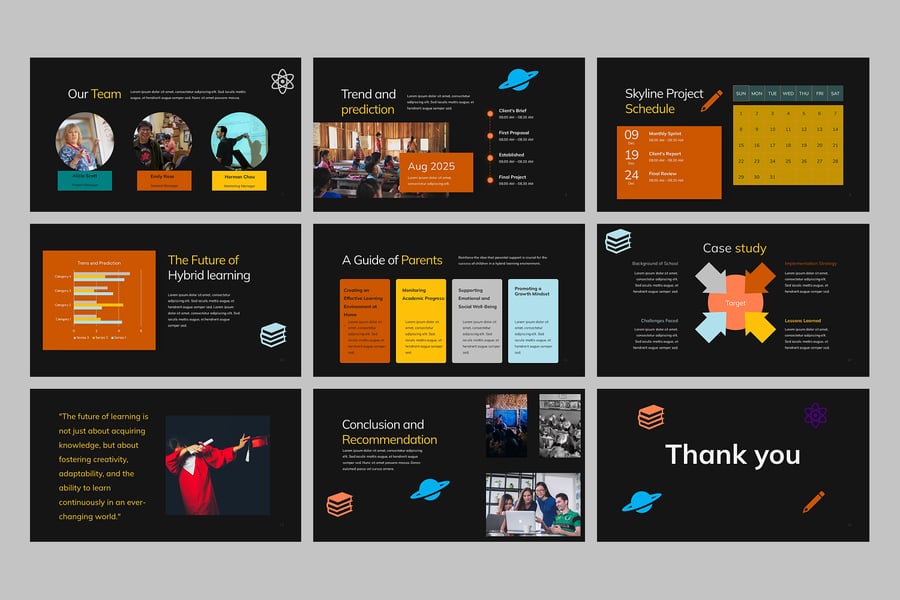 **应用场景:** 商业提案、提案演示文稿、企业演示、市场营销策略、财务报告、创业公司提案演示文稿、代理机构策划、教育研讨会、项目提案、现代演示、极简演示、炫酷演示、简洁演示、专业演示、会议演示、提案、报告、教育演示、研究演示、课堂教学及学校项目、教师培训及教育研讨会、学术报告及学生成就、学校活动、会议及家长会、在线学习及在线教育模块