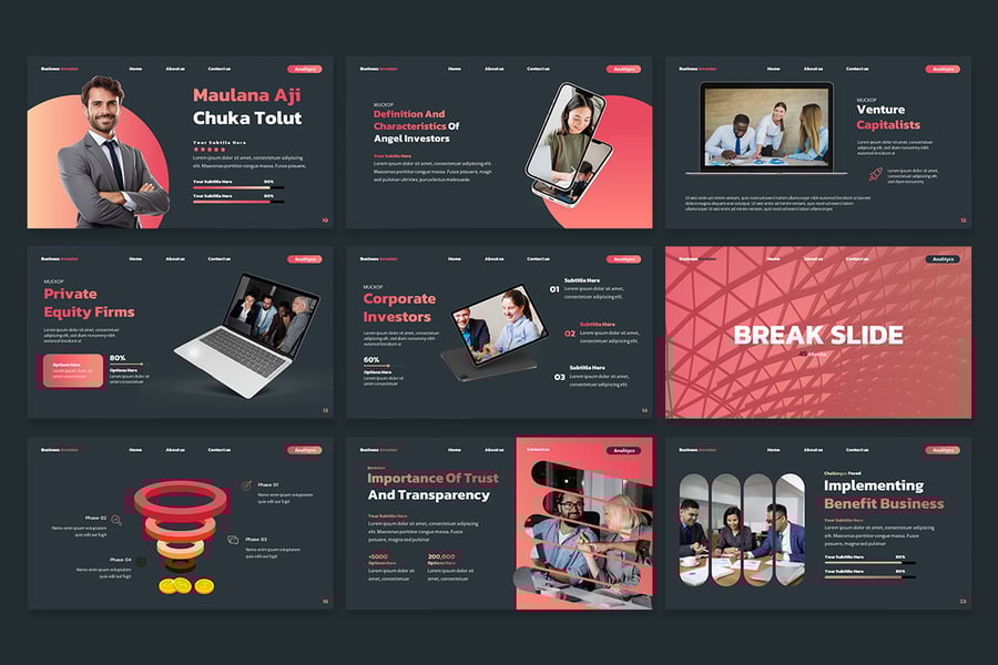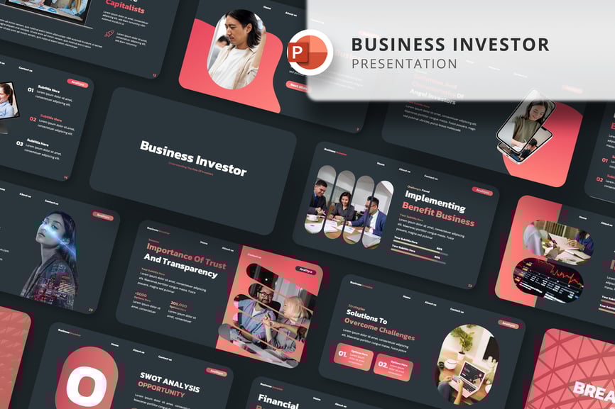 **商业投资者演示文稿模板** 风格灵活、创意十足、简洁优雅,适用于企业和个人演示。此演示文稿模板使用简便,您的演示文稿设计对公司至关重要。提升演示文稿质量,助力您的演示赢得更多客户。