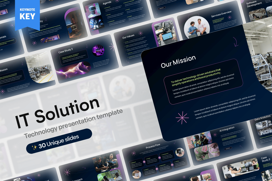 IT 解决方案是一个简洁的企业技术模板,旨在通过结构化和现代的视觉效果来展示 IT 服务、数字解决方案、系统架构、网络安全要素和基础设施细节。