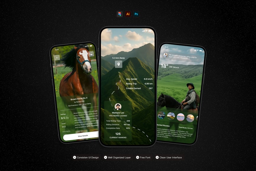 隆重推出**骑马**移动应用UI套件,这是一款现代化且功能全面的解决方案,可助您创建简洁易用的应用界面。对于希望加快设计流程的设计师和开发者而言,这款UI套件堪称完美之选,它将您所需的所有基本组件整合在一个井然有序的软件包中。