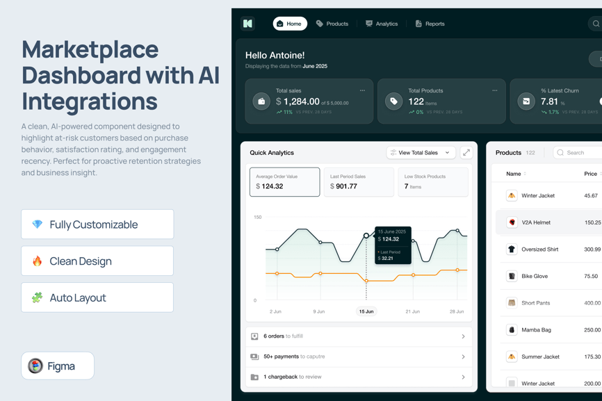 这是一个集成了人工智能的市场仪表盘管理器,设计简洁现代,界面精美。它易于定制,可根据您的需求进行全面调整。支持深色模式,并可在 Figma 中轻松使用。