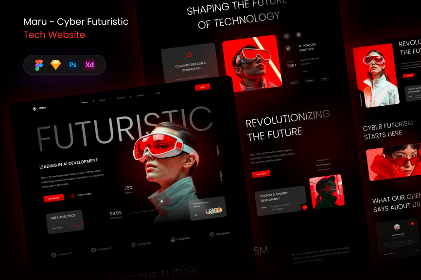 *Maru – 赛博未来科技网站* 此模板简洁却不失专业与现代感。您可以使用 Figma、Adobe XD、Sketch 和 Adobe Photoshop 进行编辑。轻松插入内容、更改颜色,所有模板均已包含在内,可直接与您的受众分享。所有组件均基于矢量图形,完全兼容、可编辑且像素级精准。此外,它们组织有序、命名清晰、分组合理。