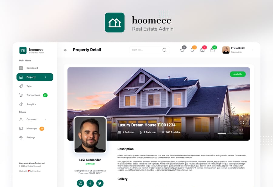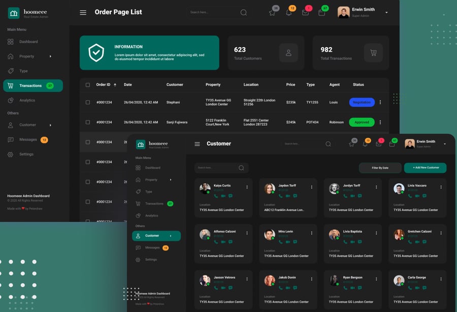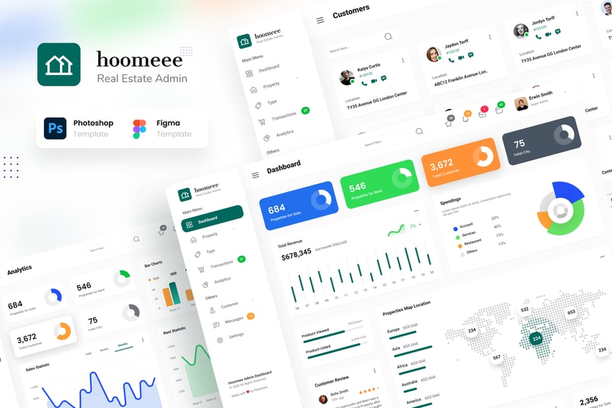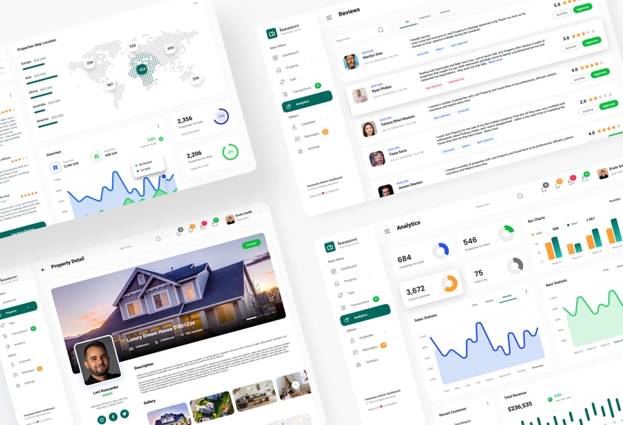 适用于房地产交易平台的现代化仪表盘用户界面设计模板。此模板非常适合用于房屋销售、房地产、房屋租赁、房屋出租管理、房源列表以及任何类型的后台管理仪表盘网站。