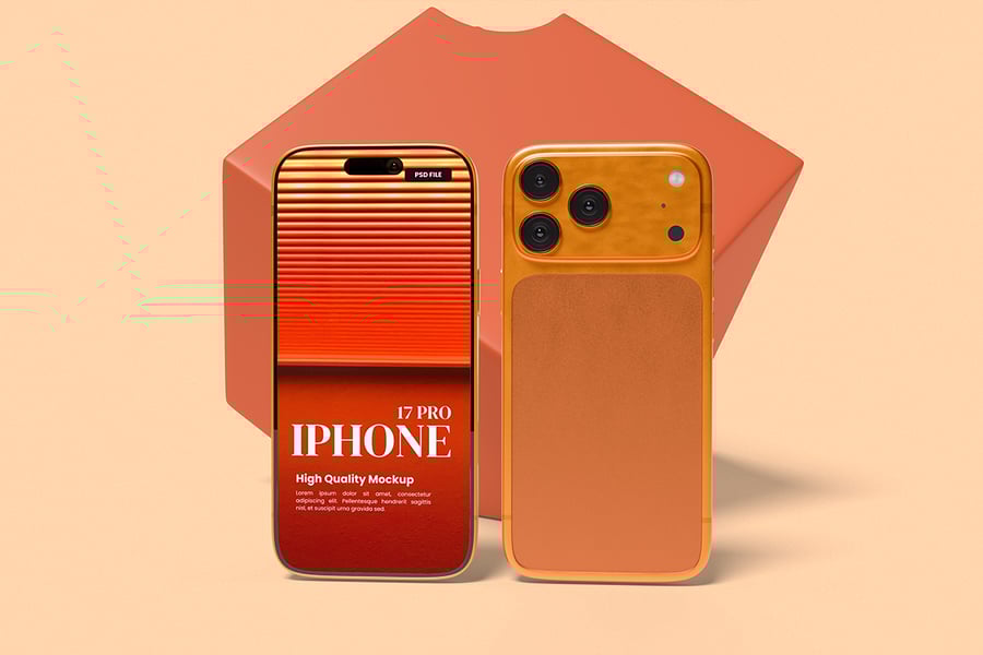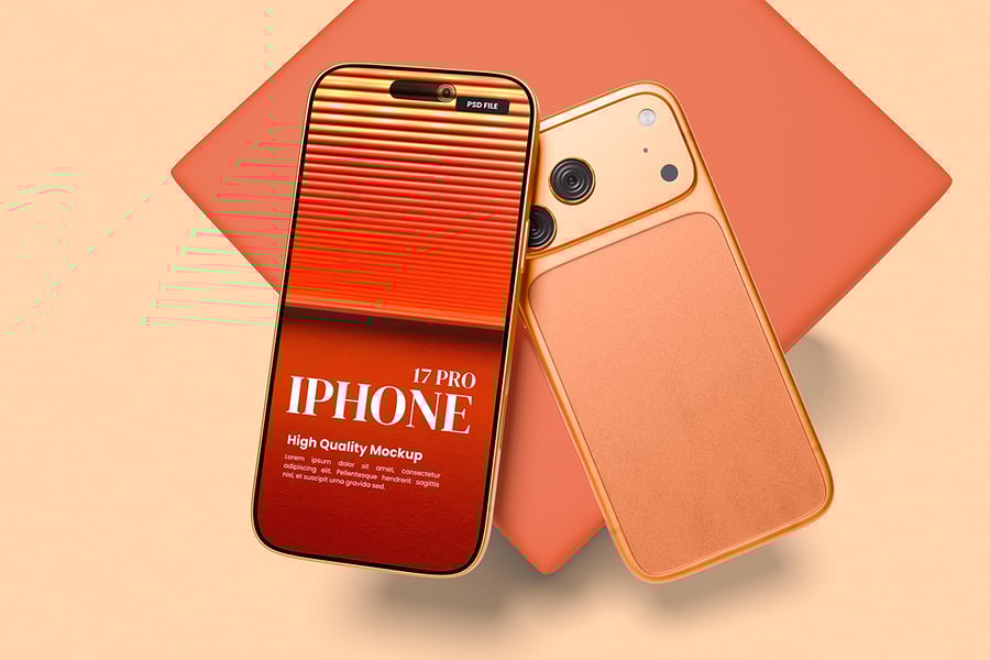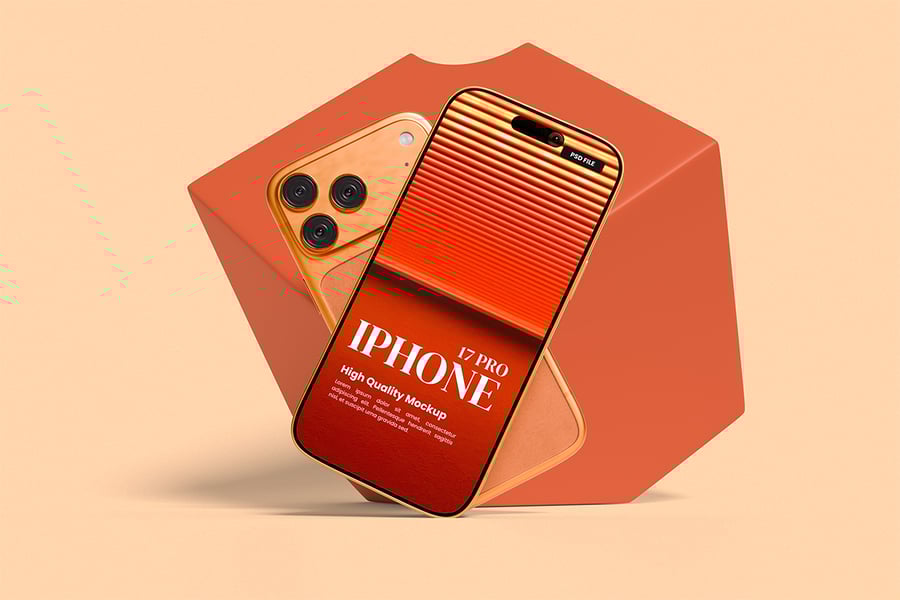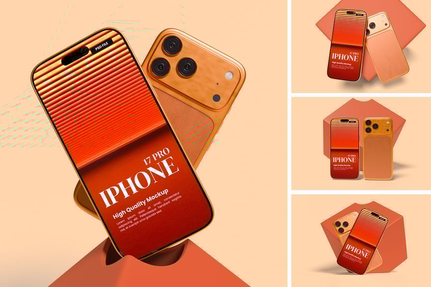用这些精美的样机展示您的 iPhone 17 Pro 模型套装设计。此样机包含 4 个项目,并提供分层清晰的 PSD 文件。此外,此样机还采用了智能对象功能,这意味着您只需几秒钟即可轻松快捷地将当前设计替换为您自己的设计。