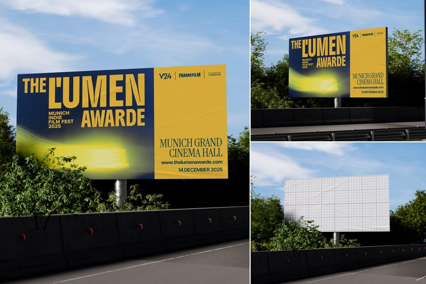将您的广告素材拖入智能对象图层,即可立即将其铺满整个广告牌。只需几秒钟即可调整阳光方向、树冠阴影或云层扩散效果,打造清晰的正午视野或温暖的日落时分氛围。轻松更换广告牌框架(黑色金属、镀锌钢)、表面材质(哑光乙烯基、亮光印刷),或添加轻微风化效果,以契合您的高速公路广告理念。