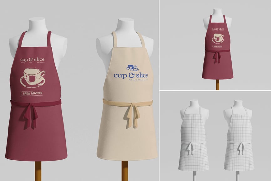 将您的设计拖入智能对象图层,即可立即将其应用到两件围裙上(正面、系带、口袋和细微的布料褶皱)。只需几秒钟即可调整围裙颜色、系带长度、模特站姿或阴影柔和度,打造清爽的白色厨师风格或温暖的咖啡馆色调。轻松更改面料纹理(棉斜纹布、帆布、牛仔布),添加刺绣、字母组合或细微磨损效果,营造逼真的厨房氛围。