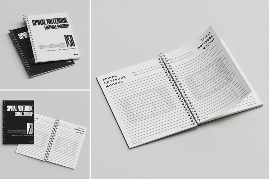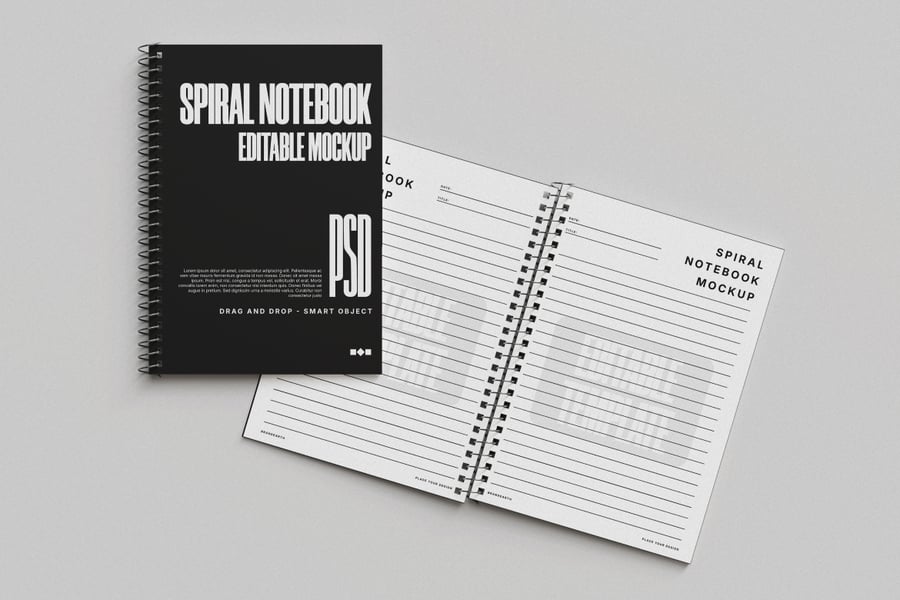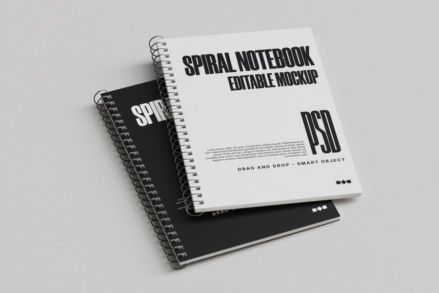 这款螺旋笔记本样机采用简洁流畅的布局,非常适合展示笔记本封面和内页设计。PSD 文件包含封面、叠放的笔记本以及带有逼真光影效果的翻页视图。您可以使用智能对象轻松编辑并插入您的设计稿。高分辨率格式,4000×3000 像素,300 DPI,是品牌推广、文具设计演示或电商展示的理想之选。