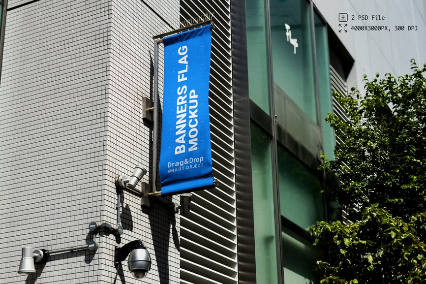 垂直横幅旗帜模型是一套高质量、逼真的模型,旨在展示现代都市环境中的横幅和旗帜设计。