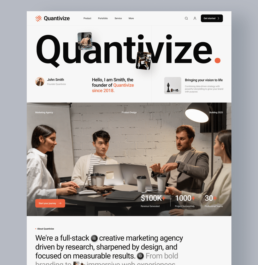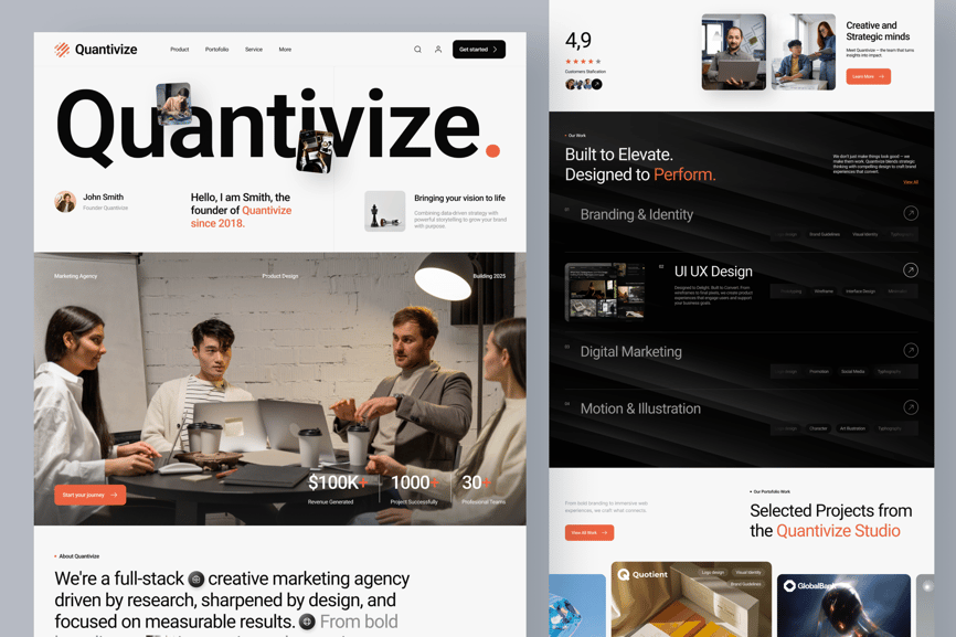 Quantivize 是一款创意机构网站落地页 UI 套件。落地页包含六个部分:首页、关于我们、我们的功能、洞察、常见问题解答和页脚。