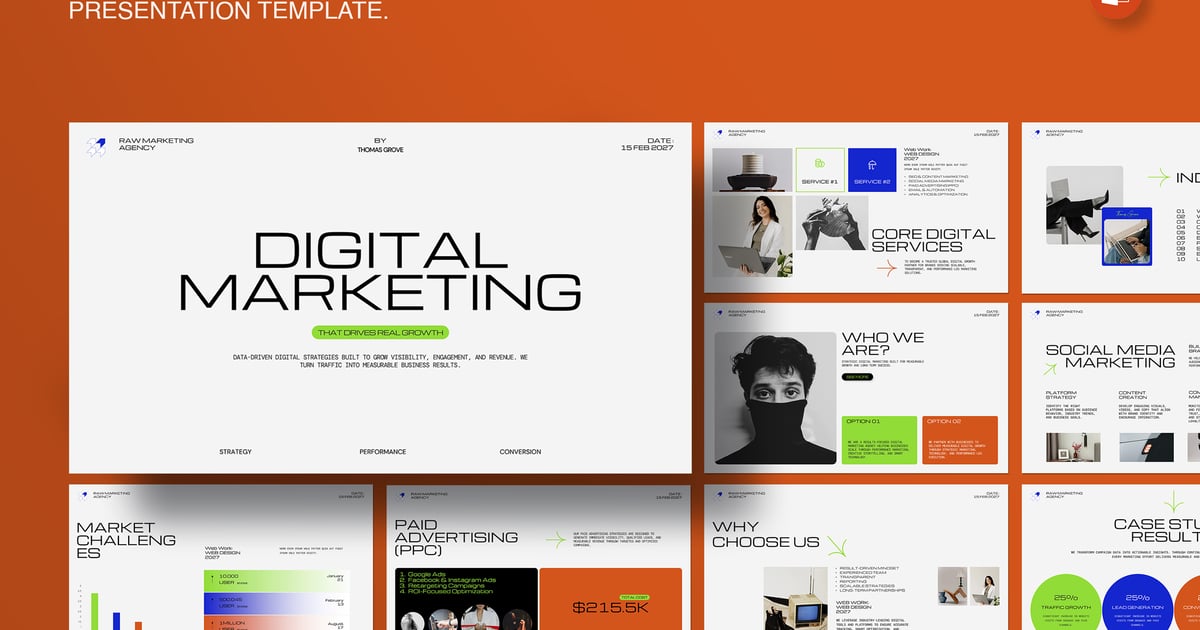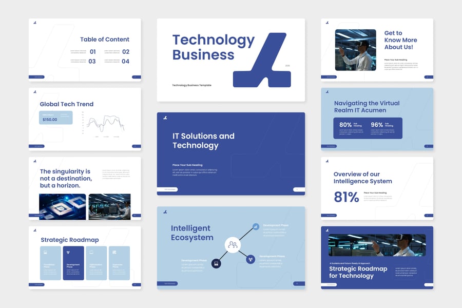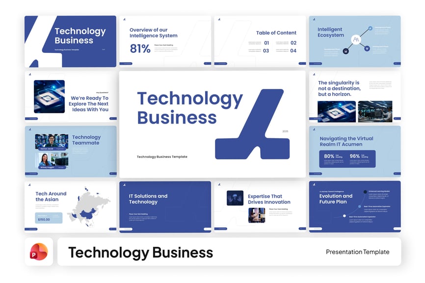 这款名为“科技商务 PowerPoint”的演示文稿模板,以商业和科技为主题,专为企业演示、IT 公司简介、技术解决方案提案、战略会议,甚至数字创业公司和创新型公司路演而设计。它适用于科技公司、IT 咨询公司、软件公司和数字产品开发团队。