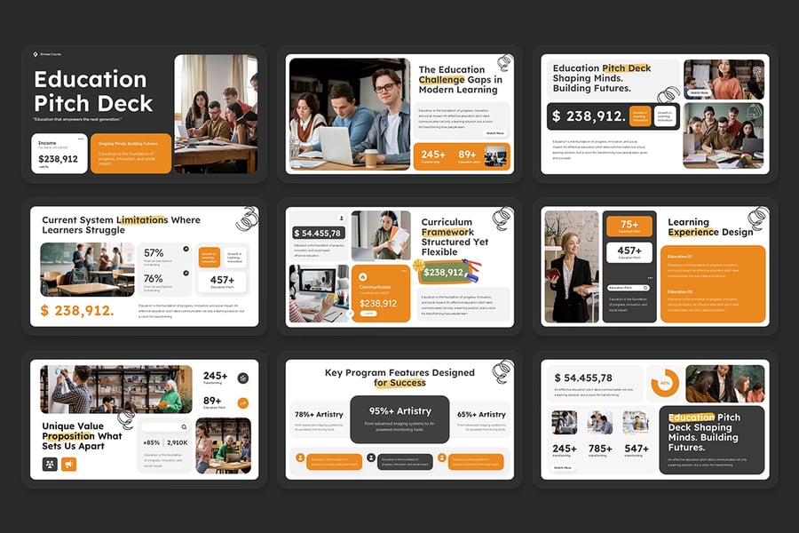 该模板的设计以清晰性、策略性和视觉效果为核心,将复杂的学习概念和教育方案转化为简洁、专业且具有说服力的叙述,能够引起任何受众的共鸣——从学校董事会和投资者到学生和利益相关者。
