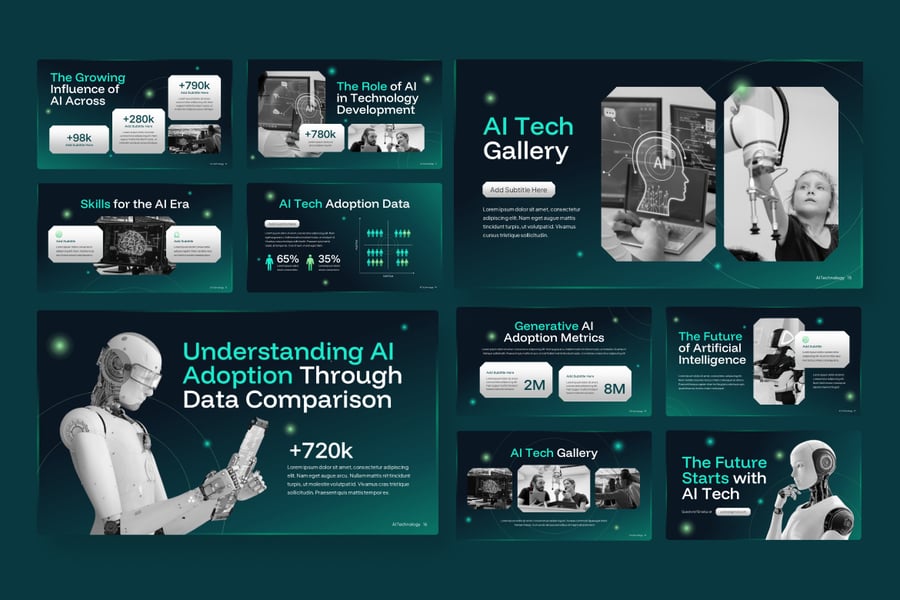 AI技术主题演讲模板是一款以人工智能和技术创新为主题的演示模板,专为IT公司、数字创业公司、软件开发商、技术顾问以及教育和技术研讨会等需求而设计。它适用于人工智能产品推介、机器学习技术、数字化转型、自动化系统演示、会议和技术研讨会等场合。