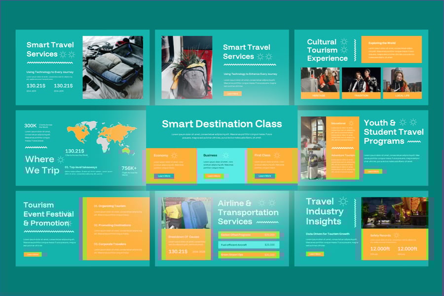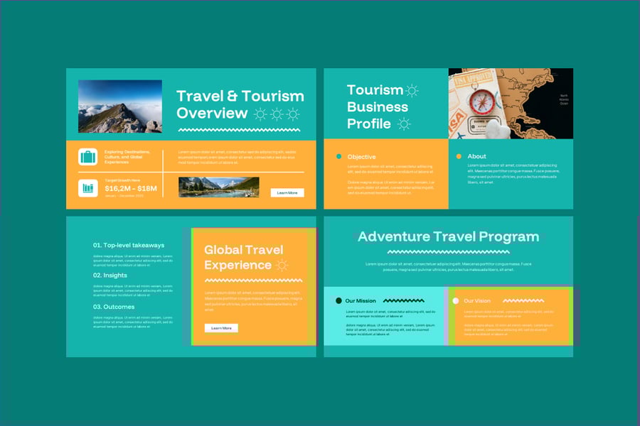 使用这款旅游主题的谷歌幻灯片演示模板,几分钟即可打造令人惊艳的专业旅游演示文稿。该模板专为旅行社、旅游运营商、酒店企业、博主和旅游营销人员设计,助您以精美的视觉叙事方式展示目的地、旅游套餐、行程安排和度假体验。