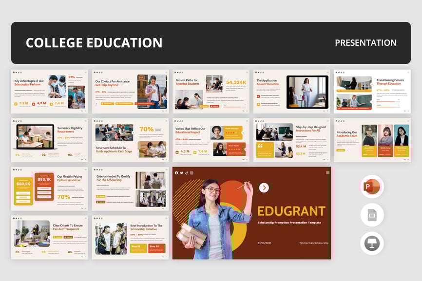 *将您的奖学金信息转化为引人入胜的视觉叙事,从而赢得信任、提升参与度并增加申请量。非常适合学术领导、学生服务人员、市场营销团队以及希望在几分钟内制作出精美且具有说服力的演示文稿的创意专业人士。*